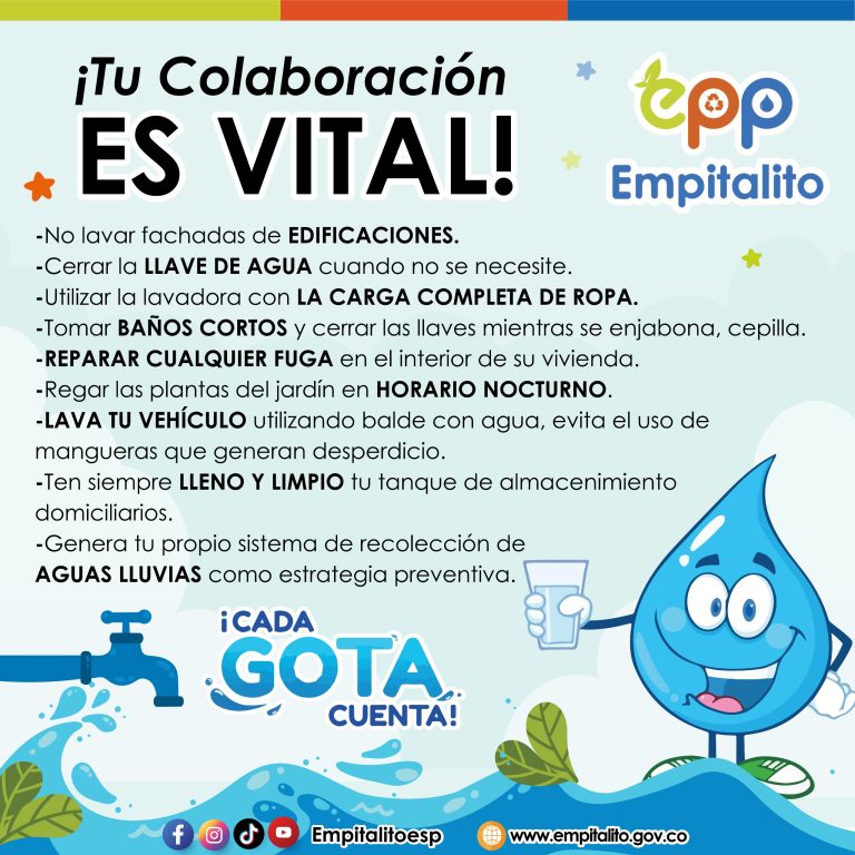 La Empresa de Servicios Públicos de Pitalito, EMPITALITO E.S.P, te invita a hacer un uso eficiente y ahorro del agua. Si eres usuario y/o suscriptor de EMPITALITO y te preguntas ¿Cómo puedes contribuir al ahorro de agua desde tu hogar? Aplica los siguientes consejos y notarás la diferencia: